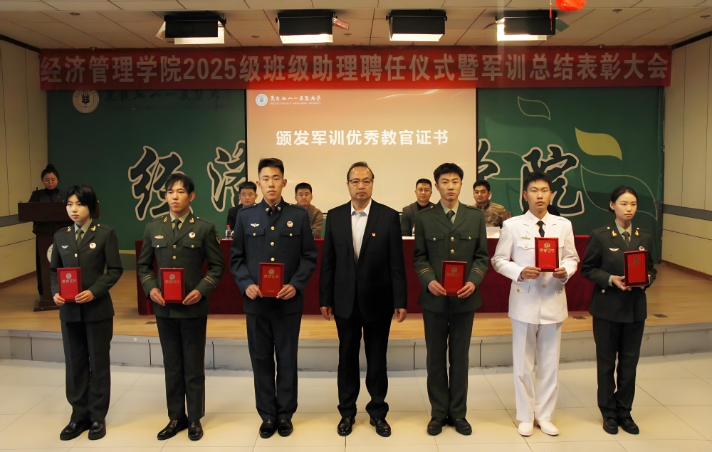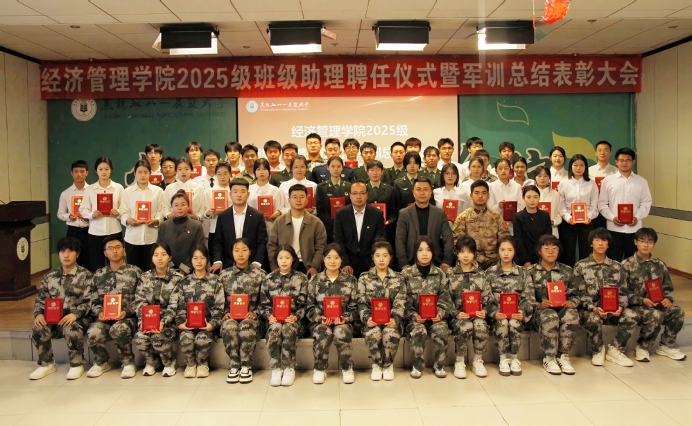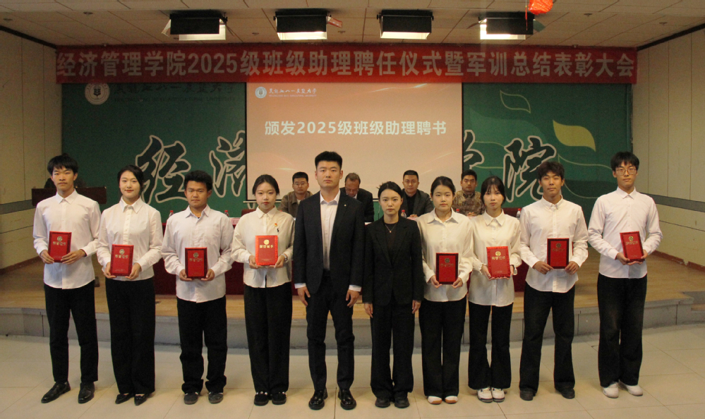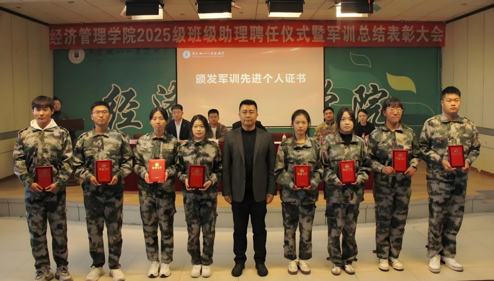 10月21日,经济管理学院在445报告厅举行2025级班级助理聘任仪式暨军训总结表彰大会。学院党委书记李志有、党委副书记张春磊、辅导员代表、2025级班级助理、新生军训教官及军训先进个人共计150余人参加会议。